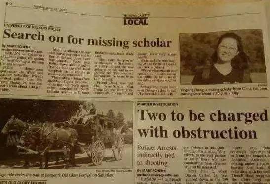 14点38分左右,此前章莹颖联系的房屋管理人员向章莹颖手机发送了一条短信,但是这条短信并没有收到回应。21点24分左右,一名伊利诺伊大学的副教授向伊利诺伊警方报告了章莹颖失踪。副教授随后和警方搜查了章莹颖所住的公寓,公寓中没有人,而且已经被。